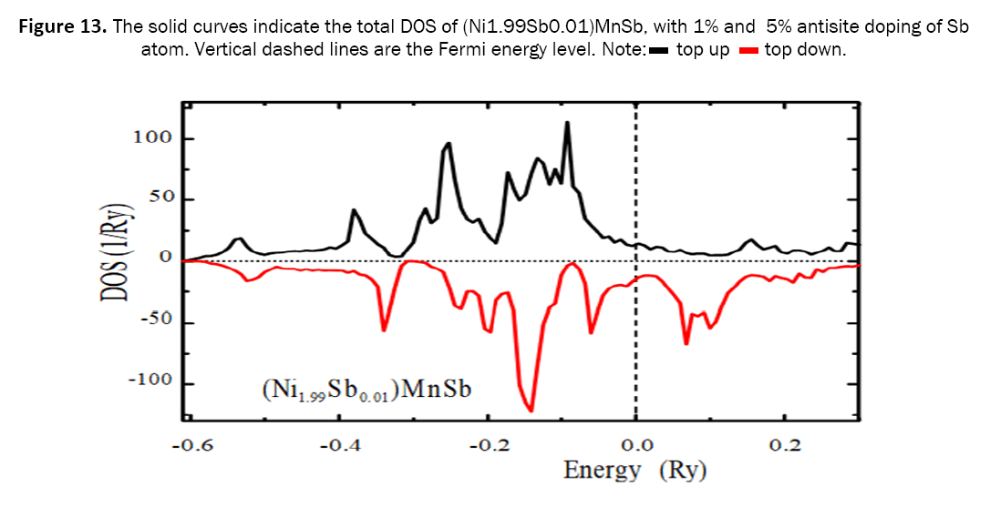 The spin resolved DOS of the FH type compounds (A2-yZy) MnZ are gathered. The DOS, a function of energy inverse, is a continuous pattern of resoluted electronic states in metal due to the presence of local potential, whereas the pattern discontinuity arises in half-metal. The total DOS by solid curves are plotted together in the figures. The valence band extends around the Fermi level and the spin-split DOS shows a large peak below the Fermi level for these compounds. In the case of FH type compounds, each Mn atom has eight A atoms as first neighbors instead of four as in the case of HH type compounds (A1-yZy) MnZ. Therefore, the hybridization effect is very important decreasing even further the Mn spin moment to less than 4 µB in the case of the compounds (Ni2-ySby)MnSb. The spin moments of A atoms are ferromagnetically coupled to the Mn spin moment and the materials possess a high spin polarization of the electron states at the Fermi level. The higher antisite doping produces more antisit moment and shifting of states, lying deep in energy, stabilizes the FM state [21].