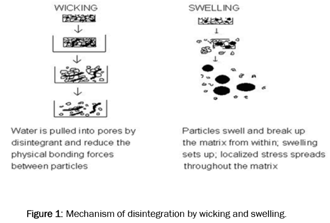 First step of disintegration is always done by capillary action. Once the tablet comes in contact with the aqueous medium it replaces the air adsorbed on the tablet by penetration of aqueous medium into the tablet. There by it weakens the intermolecular bonding and breaks the tablet into fine particles. Hydrophilicity of the drug /excipient decides the water uptake by the tablet [32]. For these types of disintegrates maintenance of porous structure and low interfacial tension towards aqueous fluid is necessary which helps in disintegration by creating a hydrophilic network around the drug particles.