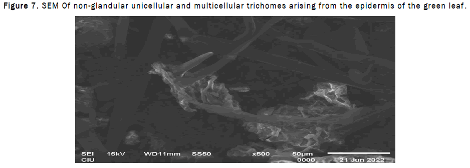 Microscopical observation of the flower reveal round and polygonal epidermal cells with multiple guard cells both on LM and SEM with a better view of the closed stomata on the SEM view. Abundant, simple, unicellular, uniseptate, and thick walled fibres can also be seen either single or multiple. Several uniseriate, uni/multicellular covering trichomes are also evident with bases arising from the epidermis (Figure 5).