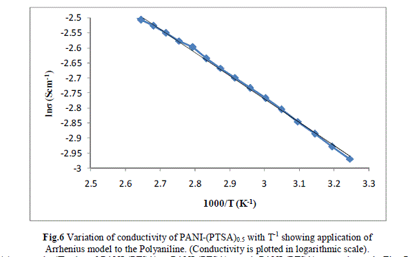 | The ln (σ) verses ln (T) plot of PANI-(PTSA)0.1, PANI-(PTSA)0.3 and PANI-(PTSA)0.5 are shown in Figs.7, 8 and 9 respectively. The ln (σ) verses ln (T) plot shows that the power law behaviour or Kivelson model, σdc = ATn , fits to the experimental data. |