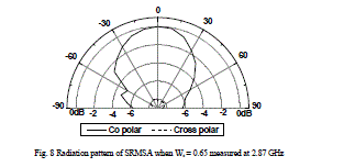 | The co-polar and cross-polar radiation pattern of CRMSA, SRMSA when Ws = 0.41 and SRMSA when Ws = 0.65 is measured at 2.92, 2.89 and 2.87 GHz and are shown in Fig 6 to 8 respectively. The obtained patterns are broad side in nature. |
