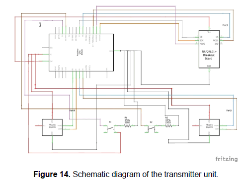 It consists of an Arduino Uno as MCU, nRF24L01 as control signal transmitter, 2 joystick modules, and 2 push buttons to take control directions (Figures 13 and 14). The unit can be powered up using pc USB cable by connecting with MCU’s USB port and batteries ranging from 5 V-20 V. The recommended supply input is 5 V-12 V [4,6]