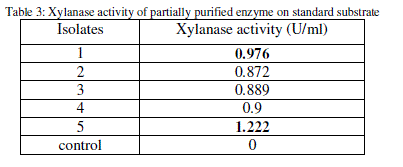 | The xylanase activity of the partially purified enzyme for all the substrates was determined by DNS method (Table 3). |