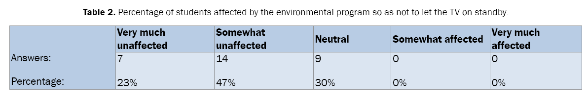 A small percentage of 7% chose the answer "Somewhat unaffected" to question 5, which asks them if their program has affected them so as not to leave the light on when leaving the room. the largest percentage (66%) chose “Somewhat affected”, while 27% chose "Very much affected". In this question too, it is obvious that the total environmental program affected the students positively, so that they now make sure to turn the lights of f when leaving a room. In question 6 of the questionnaire, one can observe that the highest percentage (47%) chose the answer "Somewhat unaffected " as to if they were affected by the program to turn of f the TV and not to leave it on standby, while 23% chose "Very much unaffected" and 30 % were "Neutral" (Table 2 and Figure 2). In this question the conclusion is that the program did not affect them much in respect to this action.