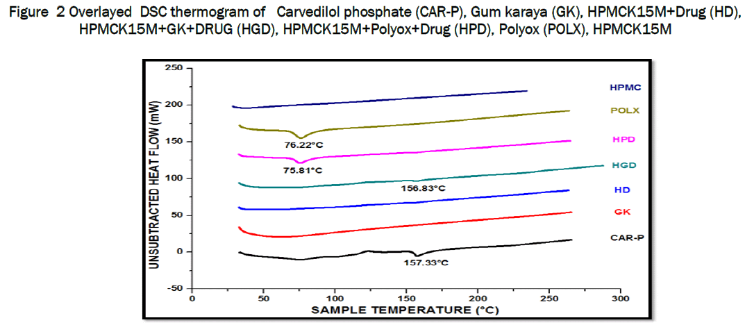 DSC measurement was carried out to provide better evidences whether predicted physical interaction would lead to drug amorphous formation in the formulations. Figure 2 shows the overlayed thermogram of Carvedilol phosphate, HPMCK15M, Polyox, Gum karaya, drug-polymeric combination according to the formulations (Table-1). Figure 2 shows the overlayed thermogram of the polymers individually and the physical mixture of polymers along with drug according to the formulation selected. The pure drug Carvedilol phosphate is having the endothermic peak at 157.11 oC. That peak is present in the HPMCK15M-GK mixture along with drug (HGD) but the peak is quite shortened. In HPD(HPMCK15M-Polyox combination with drug) and HD (HPMCK15M-drug combination)the peak of the drug are superimposed. The endothermic peak of Polyox (76.22 oC) is light shifted in HPD (75.81oC). The changes in all the DSC thermograms correspond to the changes at the respective TGA shown in the Figure 2 depict the DSC and TGA of the polymeric mixture.