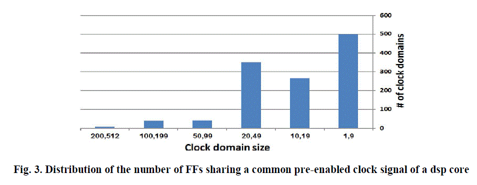 | Clock enabling signals are very well understood at the system level and thus can effectively be defined and capture the periods where functional blocks and modules do not need to be clocked. Those are later being automatically synthesized into clock enabling signals at the gate level. In many cases, clock enabling signals are manually added for every FF as a part of a design methodology. Still, when modules at a high and gate level are clocked, the state transitions of their underlying FFs depend on the data being processed. It is important to note that the entire dynamic power consumed by a system stems from the periods where modules’ clock signals are enabled.. Fig. 1 shows the FFs’ toggling activity in an arithmetic block comprising 22K FFs, designed in 40-nm technology ,taken from Ceva’s X1643 DSP core for multimedia and wireless baseband applications The statistics is obtained from extensive simulations of typical modes of operation, consisting of 240-K clock cycles. when the FFs clock signal is enabled is only 10%, which is still responsible for the entire dynamic power consumed by that block. The clock enabling signals are obtained by RTL synthesis and manual insertions. As Fig. 1 shows, a FF toggled its state only 2.9% of the clock enabled time period, on the average, thus more than 97% of the clock pulses driving FFs are useless. |