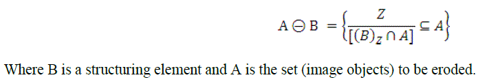 | The erosion operator takes two pieces of data as inputs. The first is the image which is to be eroded. The second is a (usually small) set of coordinate points known as a structuring element (also known as a kernel). With A and B as sets in Z2 , the erosion of A by B, denoted AÃÂôB, is defined as |
