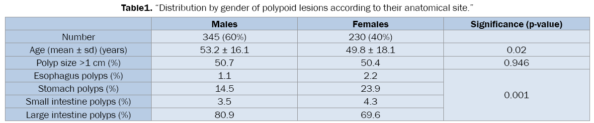 This study included five hundred seventy five consecutive patients referred to perform an endoscopic examination, regardless of their specific complains and of their possible diagnosis, to one of the two Endoscopy Centers in Tirana in the period between January 1st 2008 and December 31st 2013. Only patients from whom a polyp was resected and histologically examined were included. After subscribing the informed consent form, all patients underwent physical examination, as well as endoscopic examination. Demographic and clinical data, including anatomic site, endoscopic findings and clinical diagnosis or suspicion, were registered in all cases. At least one polyp was resected and histologically examined in all included patient.