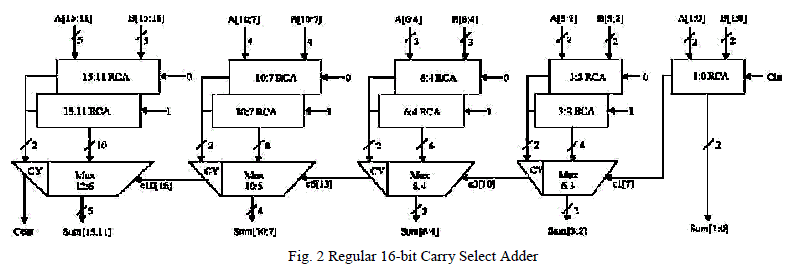 | The Architecture of Regular 16-bit carry select adder is shown in fig 2. It has five groups, each is of different size. |