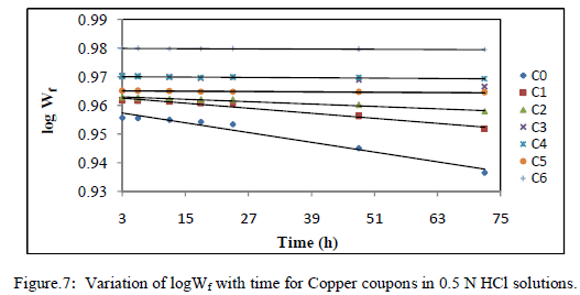 | Where Wo is the initial weight before immersion, k is the rate constant and t is time. Fig -7 depicts the plot of log of the weight of copper after treatment (log Wf) against time (t). |
