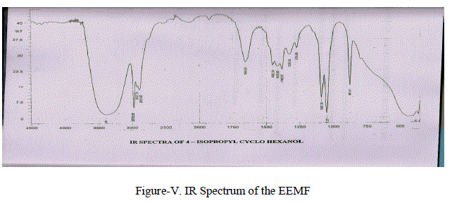 | 13C NMR Spectral values showed the following Chemical shift for the Carbon atoms δ 77.04 corresponds to C1.δ34.02, δ28.80, δ28.80 and δ24.07 were due to (-CH2-) groups. δ24.713 may be due to (-CH-) group.δ 16.942 and δ 22.43 Corresponds to (-CH3-) groups. From all the above studies, we concluded that the compound isolated from One of the component present in EEMF was found to be4-Isopropyl cyclohexanol. |