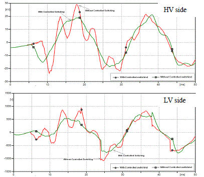 | Due to using the PIR, the SOV at the HV side of the wind turbine transformers of row A is reduced from 1.526 pu (29.08 kV) to 1.108 pu (21.1 kV) and from 1.576 pu (1.087 kV) to 1.1965 pu (0.826 kV) at the LV side, as shown in Fig. 4. Fig. 5 illustrates the SOV due to using controlled switching of the circuit breaker at the HV side of the wind turbine transformers of row A which is reduced from 1.5266 pu (29.08 kV) to 0.9929 pu (18.915 kV) and from 1.576 pu (1.087 kV) to 1.124 pu (0.7758 kV) at the LV side. |