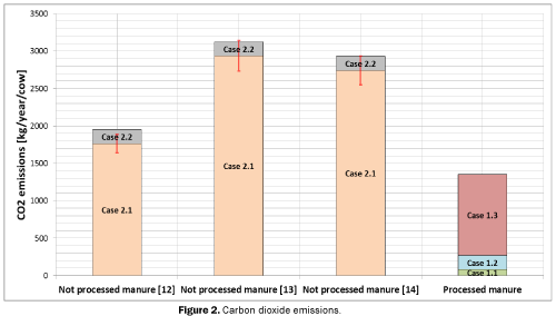 Two different cases were taken in account: processed manure (Case 1) and not processed manure (Case 2). In the first case the emissions would be due to the CH4 reacting in the combustion (Case 1.1), to the CO2 present in biogas and no reacting in combustion (Case 1.2) and to the CO2 resulting by the production of energy consumed in the lab – assuming it is produced by natural gas (Case 1.3). In the second case, emissions would be due to the outside standing manure producing CH4 (Case 2.1) and to the emission of CO2 resulting by the production of energy of the previous case (Case 2.2).