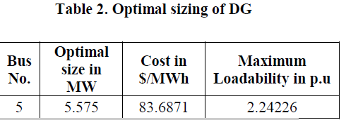 | Optimal Sizing of DG will takes place on load buses and determine the best optimal location and DG size with the constraint of maximum loadability and minimizing DG Cost that will be discussed in Table2. |