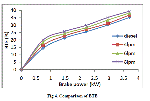 | 4.1 Performance analysis 4.1.1 Brake Thermal Efficiency Fig. 4 shows the variation in brake thermal efficiency with brake power for different flow rates of hydrogen. The 8 lpm hydrogen addition gives the highest brake thermal efficiency (39.42%) compared to diesel (35.21%) at full load. The brake thermal efficiency increases with higher hydrogen enrichment. The increase in brake thermal efficiency is due to hydrogen’s higher calorific value and better mixing with air in addition to its faster burning rate characteristics [22]. It was observed that the hydrogen addition with inlet air showed the improved performance compared to normal neat diesel operation. |