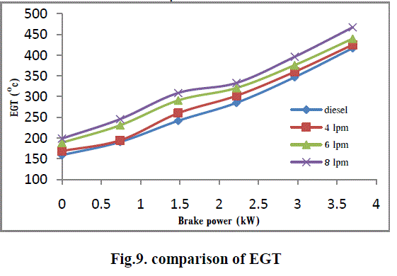 | 4.2.4 Exhaust gas temperature The variation of exhaust gas temperature with brake power and different proportions of hydrogen enrichment is shown in Fig 9. It is observed that the exhaust gas temperate value of 4 lpm, 6 lpm and 8 lpm hydrogen and diesel fuel operation increased averagely compared to diesel at, full load respectively. The highest exhaust temperature 467 °C with 8 lpm hydrogen addition compared to 425 °C for diesel. This is due to better mixing of hydrogen with air resulting in complete combustion of fuel with the increase in temperature around the combustion chamber. [28]. |