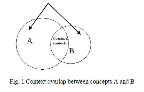 | In the existing methods the similarity between two words for clustering are calculated based on their distributions among the documents. For two given words, distributional similarity obtains collective contextual information for each word and computes how similar their context vectors are. That is for two concepts1 to be similar it does not require the concepts to co-occur in the same contexts2. Distributional similarity has the ability to find âÃâ¬Ãâ¢indirectâÃâ¬Ãâ similarity but it cannot classify them accordingly. In contrast semantic or PMI [10] similarity determines how much commonality they share for two concepts to be similar. Typically a concepts meaning can be determined by its context in which it occur. Therefore considering this fact, two concepts are said to be semantically similar if their contexts overlap as explained in Fig. 1. |