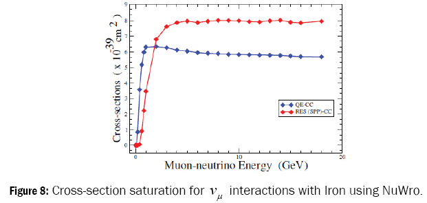 The Figure 7 shows our cross-section measurements for DIS process with iron and protons as targets. A linear dependence of the cross-sections on neutrino energy which is exhibited in the higher ranges is a con formation of the quark parton model predictions. This is because as the energy increases, the neutrino begins to probe the nucleus up to nucleon degrees of freedom. There is a point like scattering (one to one interaction) by the quarks which leads to a linear dependence of neutrino crosssections. This linearity breaks down at low energies because of sensing of nuclear effects by the projectile. For QE and RES processes, the cross-sections saturate towards increasing energies as shown in our measurements by Figure 8 for a heavier target (Iron) and by the Figure 9 for a lighter target (oxygen).