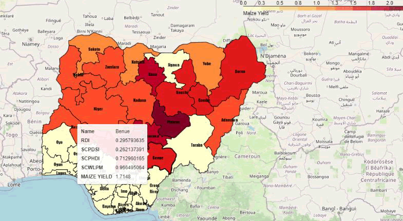 For the North-eastern states, Adamawa state produced the means of RDI, SCPDSI, SCPHDI and SCWLPM are -0.1822, -0.6753, -0.7071 and -0.6030 respectively with a maize yield of 1.488 tonnes in 25 years. In Bauchi state, the means of RDI, SCPDSI,SCPHDI and SCWLPM are 0.5030, 0.5214, 0.5682 and 0.5313 respectively with a maize yield of 1.7224 tonnes in 25 years. InBorno state, the means of RDI, SCPDSI, SCPHDI and SCWLPM are 0.2958, 0.9200, 1.1953 and 0.6787 respectively with a maize yield of 1.6252 tonnes in 25 years. In Gombe state, the means of RDI, SCPDSI, SCPHDI and SCWLPM are 0.1125, -0.5643, -0.6986 and -0.6497 respectively with a maize yield of 1.59 tonnes in 25 years. In Yobe state, the means of RDI, SCPDSI, SCPHDI and SCWLPM are -0.0285, -0.8787, -0.6166 and -0.5505 respectively with a maize yield of 1.0656 tonnes in 25 years. In the Northeast states, Yobe state has the lowest maize yield of 1.0656 tonnes [32,33].