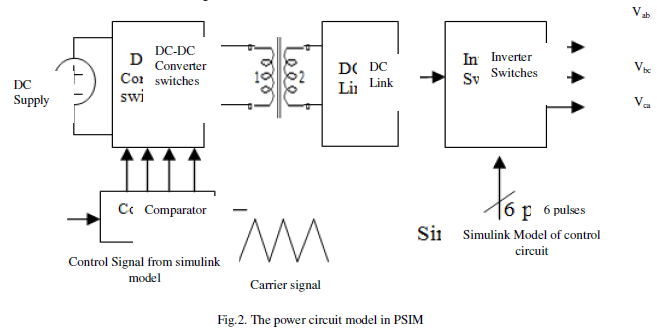 | The required speed and actual speed difference is calculated and the speed error is minimized using a PI controller. The output of controller decides the control voltage needed for the PWM switching of isolated DC-DC converter switches. The control voltage is compared with a high frequency carrier (which is also the switching frequency of the converter switches) and the duty ratio of the converter switches is varied. So by using this method a variable output voltage is obtained in the DC link. An additional advantage is that the turns ratio of the converter also helps in modulating the DC link voltage. |