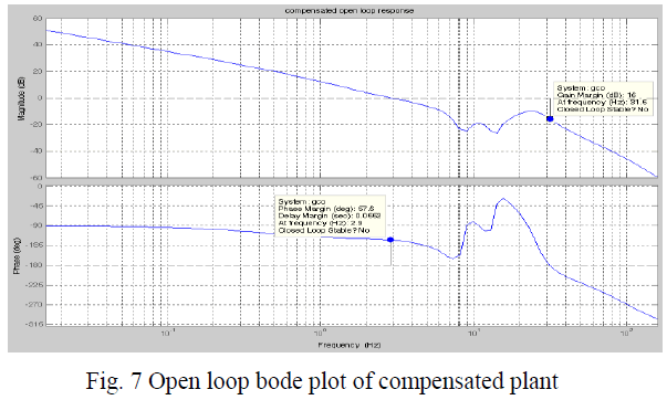 Fig 6 shows the simulink modal of the system after compensation. In figure block „gr‟ shows the rate filter inserted in feedback path and block g11 shows the position loop compensator which includes both lag compensator and notch filter. After applying compensation the open loop bode of the system is obtained as: