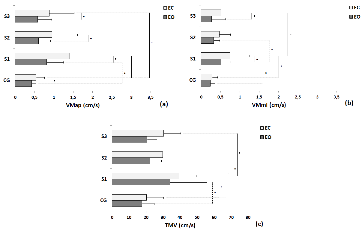 | Fig 3. Comparisons of control group (CG) and participants with stroke (S) in the three trials in terms of mean, standard deviation and statistical values for the EO and EC conditions of follow variables: (a) Mean velocity for AP (VMap - a) and ML (VMml - b) directions, and Total mean velocity (TMV – c). Legend: * = p< 0.05 between EO condition; âÃâÃâ¹ = p< 0.05 between EC condition; âÃâà= p<0.05 between EO and EC condition; S1 = first trial; S2 = second trial; S3 = third trial. |