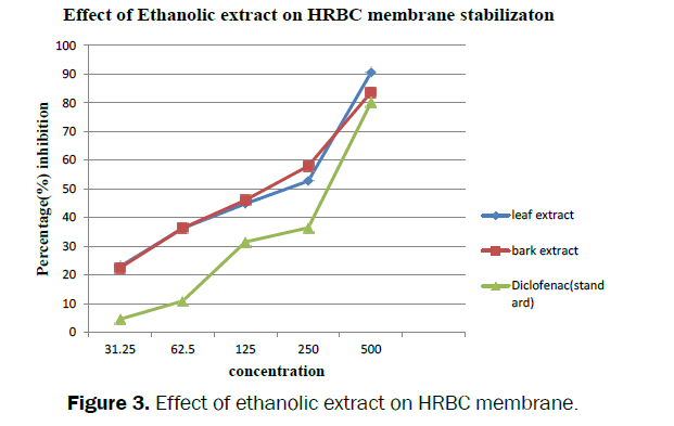 The principle involved here is stabilization of human red blood cell membrane by hypo tonicity induced membrane lysis [47]. The assay mixture contains 1 ml phosphate buffer [pH 7.4, 0.15 M], 2 ml hypo saline [0.36%], 0.5 ml HRBC suspension[10% v/v]) with 0.5 ml of plant extracts of various concentrations (31.25, 62.5, 125, 250, 500, μg/0.5 ml), standard drug diclofenac sodium (31.25, 62.5, 125, 250, 500 μg/0.5 ml) and control [distilled water instead of hypo saline to produce 100% hemolysis] were incubated at 37°C for 30 min and centrifuged respectively. The hemoglobin content in the suspension was estimated using spectrophotometer at 560 nm. The percentage hemolysis produced in the presence of distilled water was taken as 100%. The results were tabulated in Figures 2 and 3 [48-52].