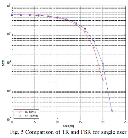 | The performance of TR and FSR systems are compared for multi-user. The frame length of TR is = 600 nsec with = 300 nsec and the number of frames per bit is = 6. The chip duration is = 75 nsec. The number of hops = 4, with hopping time period is = 1000. The frame duration of FSR is = 300 nsec, and number of frames per bit = 11. The chip duration is = 75 nsec, with number of hops = 4, and time hopping period = 1000. From the Fig. 7, we observe that, due to the presence of IFI, the performance of TR flat out at higher SNR, however the performance of TR is better than FSR [7]. |