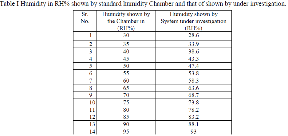 | D. Implementation of smart sensor material to measure humidity: A humidity sensor module, an embedded design is implemented to measure humidity of the environment. The present system is exposed to the humidity from 30RH% to 95%RH and the recovered observations are presented in table 1. On inspection of table 1, it is found that the humidity readings shown by the system under investigation and that of shown by humidity chamber are closely matched. This supports the reliability in the embedded system design. |