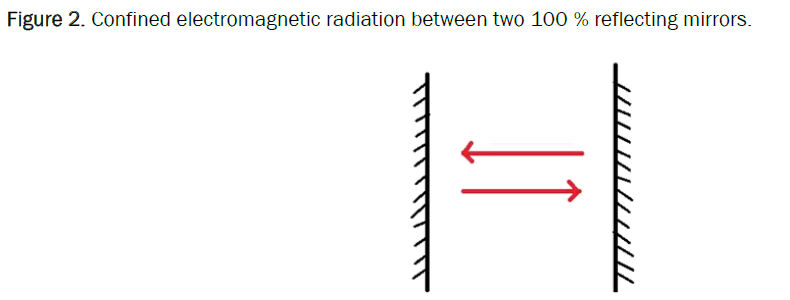 Figure 2 represents confined electromagnetic radiation with amplitude E0 and frequency. A general property of confined electromagnetic waves is the proportionality between energy and frequency. As an example the confinement of light between two perfect reflecting mirrors with surface A has been chosen.