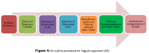 Taguchi Technique: For the optimization process in this work Taguchi technique was used. Taguchi technique is a powerful methodology to contract with the response controlled by the number of parameters. Taguchi design is applied to devise the experimental layout, examine the effect of each parameter and to determine the optimal level of each identified parameter. Taguchi design utilizes an orthogonal array to study the whole space with minimum number of experiments and hence it is achievable to condense time and cost of the experimental research. Taguchi method consists of plan of experiments, in which the factors are situated at different rows in an intended orthogonal array [27-32]. An orthogonal array provides more consistent estimates of factor effects with little number of experiments when compared to conventional methods. Depending on number of factors and identified levels of each factor, an appropriate array is chosen. Each column of the orthogonal array delegates a parameter and its setting levels in each experiment and each row entrusts an experiment with the level of several parameters in that experiment. After performing the experiments as per orthogonal array (OA), the results are converted into signal to noise (S/N) ratio data [33]. Taguchi technique is also a powerful tool for the design of high quality systems. It provides a simple efficient and systematic approach to optimize designs for performance, quality and cost. The methodology is valuable when design parameters are qualitative and discrete. Taguchi parameter design can optimize the performance characteristics through the setting of design parameters and reduce the sensitivity of the system performance to source of variation. This technique is a multi-step process, which follow a certain sequence for the experiments to yield an improved understanding of product or process performance. An outline procedure for Taguchi approach is shown very clearly with the help of flowchart as shown in Figure 4. This design of experiments process made up of three main phases: The planning phase, the conducting phase and analysis interpretation phase. The planning phase is the most important phase and one must give a maximum importance to this phase. The data collected from all the experiments in the set are analyzed to determine the effect of various design parameters. Figure 4 indicates an outline procedure for Taguchi approach. This approach is to use a fractional factorial approach and this may be accomplished with the aid of orthogonal arrays. Analysis of variance is a mathematical technique, which is based on a least square approach. The treatment of the experimental results is based on the analysis of average and analysis of variance [34].