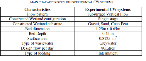 | Two experimental subsurface VFCW systems each of dimension 1.25m (length) x 0.65m (width) x 0.5m (depth) were designed based on the flow rate and organic loading rate [18]. A control system with unplanted filter bed was developed to compare the results and to study the role of vegetation in CW systems. The flow rate was maintained at 80 Litres/day. Greywater was fed into the wetland bed through the inlet arrangement connected to a feeding tank with an intermittent feeding mechanism of 40Litres per feed. A dosing interval of 12 hours was provided between successive feeds. The wastewater drains vertically down through the filter bed and the treated water was collected through the outlet provided at the bottom. The main characteristics of the CW systems are shown in Table 2. |